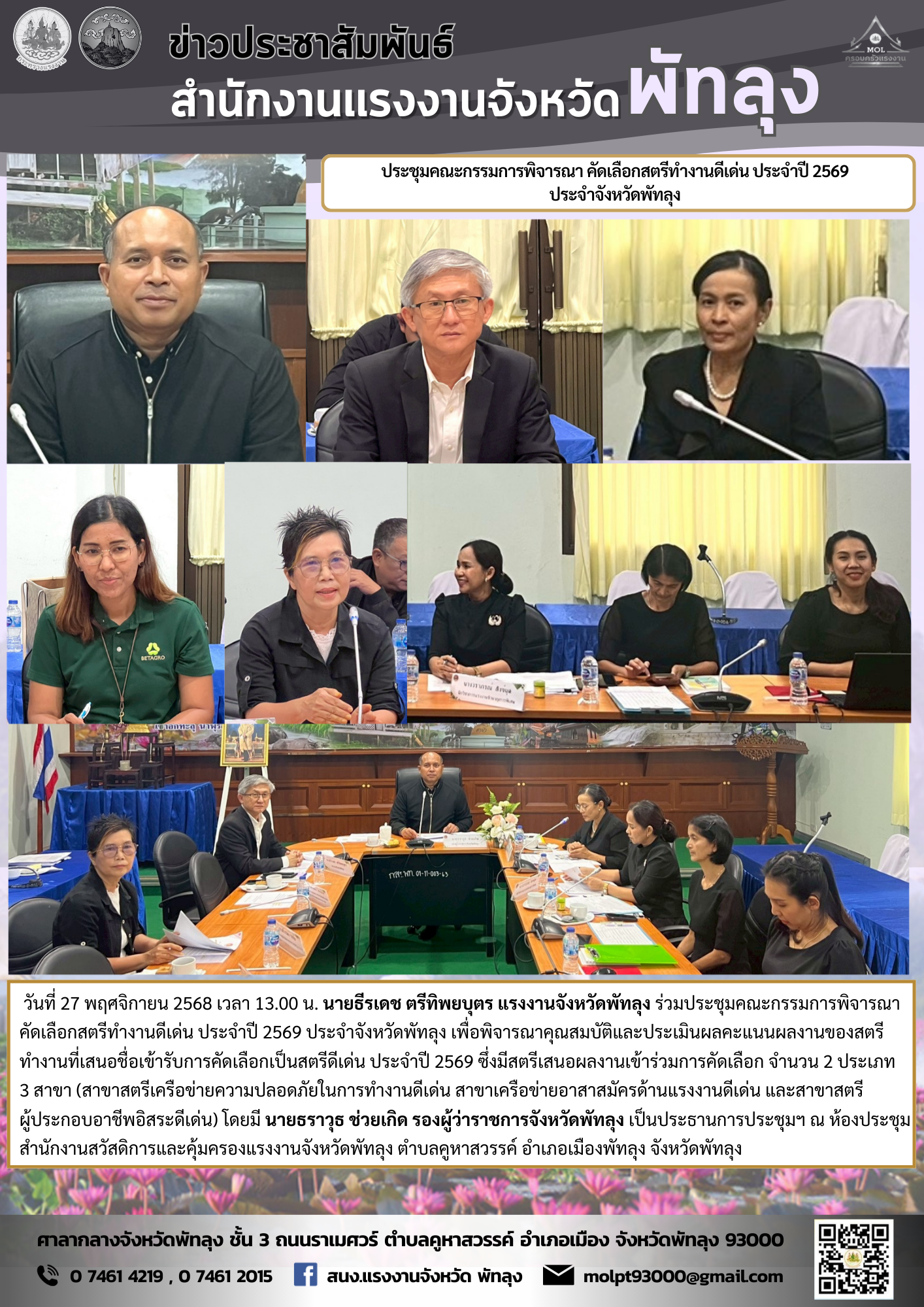 วันที่ 27 พฤศจิกายน 2568 เวลา 13.00 น. นายธีรเดช ตรีทิพยบุตร แรงงานจังหวัดพัทลุง ร่วมประชุมคณะกรรมการพิจารณา คัดเลือกสตรีทำงานดีเด่น ประจำปี 2569 ประจำจังหวัดพัทลุง เพื่อพิจารณาคุณสมบัติและประเมินผลคะแนนผลงานของสตรีทำงานที่เสนอชื่อเข้ารับการคัดเลือกเป็นสตรีดีเด่น ประจำปี 2569 ซึ่งมีสตรีเสนอผลงานเข้าร่วมการคัดเลือก จำนวน 2 ประเภท 3 สาขา (สาขาสตรีเครือข่ายความปลอดภัยในการทำงานดีเด่น สาขาเครือข่ายอาสาสมัครด้านแรงงานดีเด่น และสาขาสตรี ผู้ประกอบอาชีพอิสระดีเด่น) โดยมี นายธราวุธ ช่วยเกิด รองผู้ว่าราชการจังหวัดพัทลุง เป็นประธานการประชุมฯ ณ ห้องประชุมสำนักงานสวัสดิการและคุ้มครองแรงงานจังหวัดพัทลุง ตำบลคูหาสวรรค์ อำเภอเมืองพัทลุง จังหวัดพัทลุง