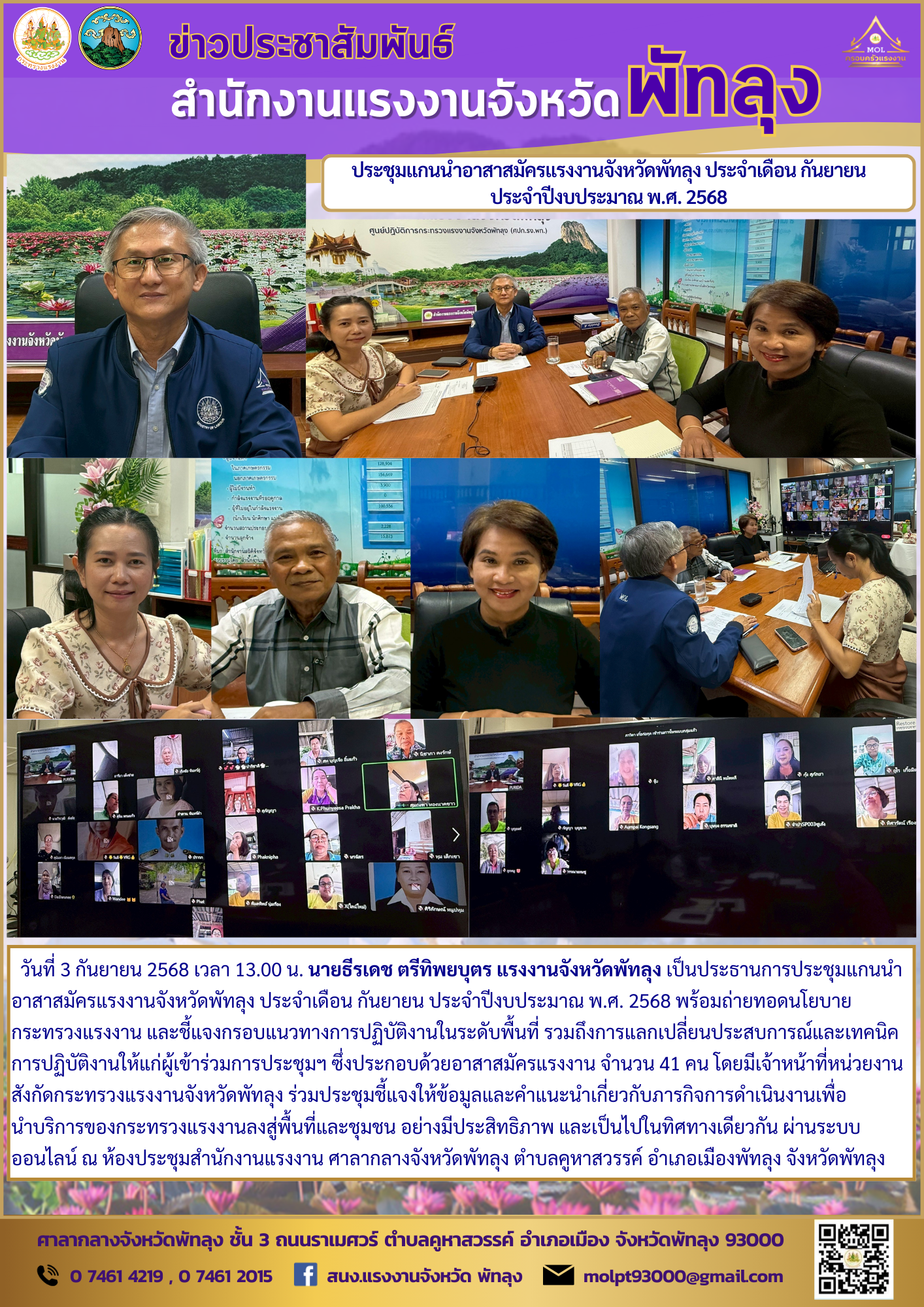 วันที่ 3 กันยายน 2568 เวลา 13.00 น. นายธีรเดช ตรีทิพยบุตร แรงงานจังหวัดพัทลุง เป็นประธานการประชุมแกนนำอาสาสมัครแรงงานจังหวัดพัทลุง ประจำเดือน กันยายน ประจำปีงบประมาณ พ.ศ. 2568 พร้อมถ่ายทอดนโยบายกระทรวงแรงงาน และชี้แจงกรอบแนวทางการปฏิบัติงานในระดับพื้นที่ รวมถึงการแลกเปลี่ยนประสบการณ์และเทคนิคการปฏิบัติงานให้แก่ผู้เข้าร่วมการประชุมฯ ซึ่งประกอบด้วยอาสาสมัครแรงงาน จำนวน 41 คน โดยมีเจ้าหน้าที่หน่วยงานสังกัดกระทรวงแรงงานจังหวัดพัทลุง ร่วมประชุมชี้แจงให้ข้อมูลและคำแนะนำเกี่ยวกับภารกิจการดำเนินงานเพื่อ นำบริการของกระทรวงแรงงานลงสู่พื้นที่และชุมชน อย่างมีประสิทธิภาพ และเป็นไปในทิศทางเดียวกัน ผ่านระบบออนไลน์ ณ ห้องประชุมสำนักงานแรงงาน ศาลากลางจังหวัดพัทลุง ตำบลคูหาสวรรค์ อำเภอเมืองพัทลุง จังหวัดพัทลุง