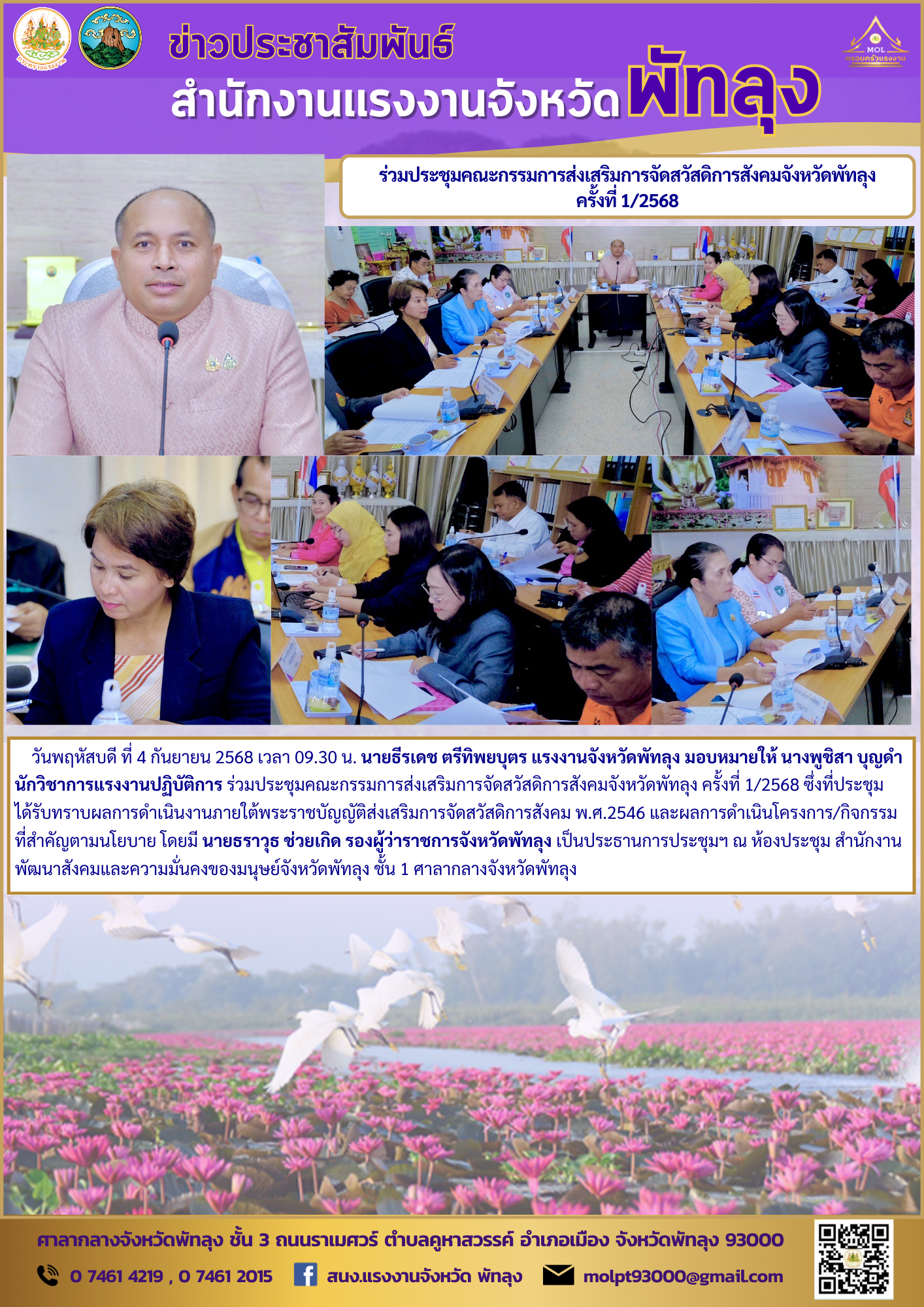 วันพฤหัสบดี ที่ 4 กันยายน 2568 เวลา 09.30 น. นายธีรเดช ตรีทิพยบุตร แรงงานจังหวัดพัทลุง มอบหมายให้ นางพูชิสา บุญดำ นักวิชาการแรงงานปฏิบัติการ ร่วมประชุมคณะกรรมการส่งเสริมการจัดสวัสดิการสังคมจังหวัดพัทลุง ครั้งที่ 1/2568 ซึ่งที่ประชุม ได้รับทราบผลการดำเนินงานภายใต้พระราชบัญญัติส่งเสริมการจัดสวัสดิการสังคม พ.ศ.2546 และผลการดำเนินโครงการ/กิจกรรมที่สำคัญตามนโยบาย โดยมี นายธราวุธ ช่วยเกิด รองผู้ว่าราชการจังหวัดพัทลุง เป็นประธานการประชุมฯ ณ ห้องประชุม สำนักงานพัฒนาสังคมและความมั่นคงของมนุษย์จังหวัดพัทลุง ชั้น 1 ศาลากลางจังหวัดพัทลุง