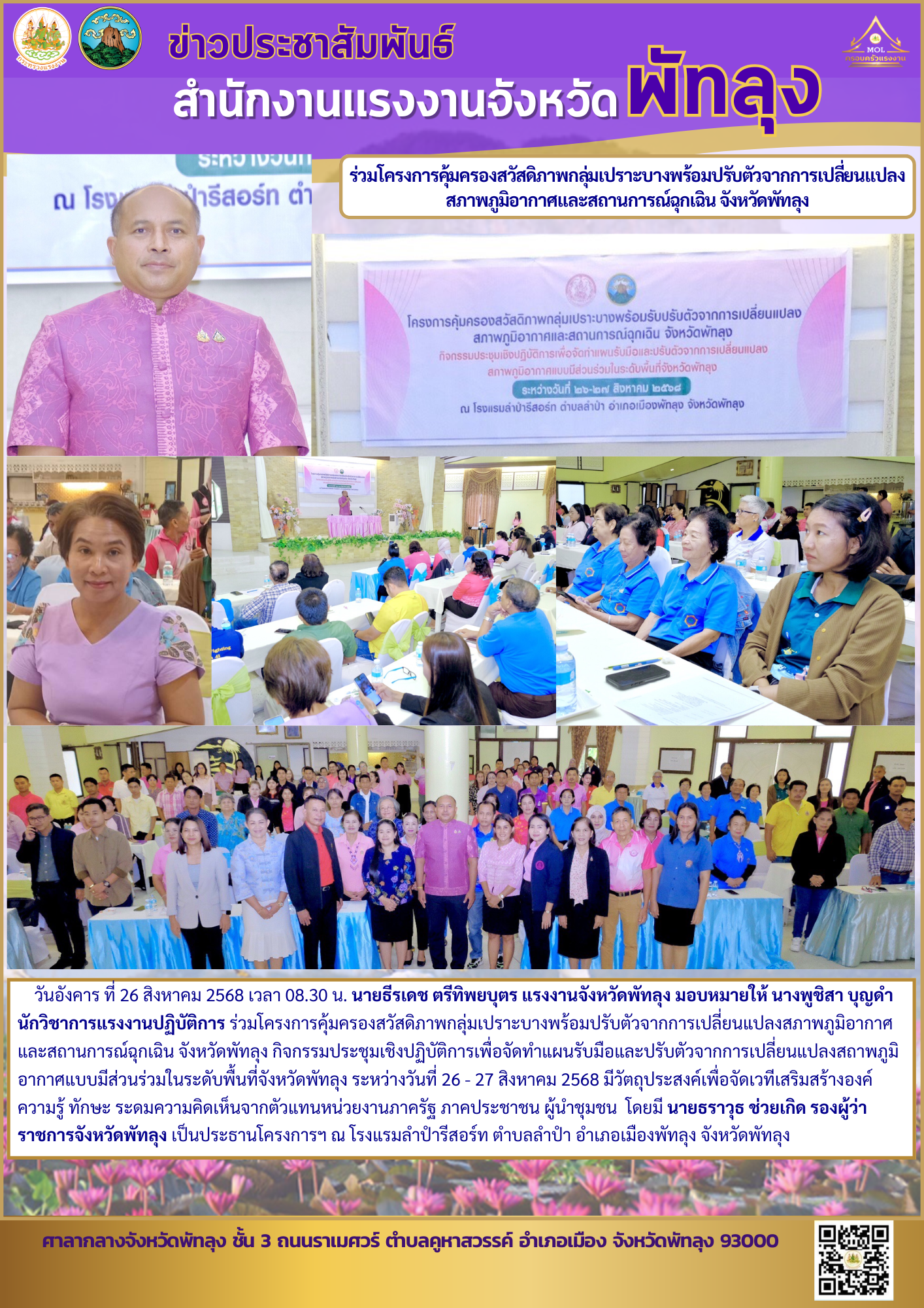 วันอังคาร ที่ 26 สิงหาคม 2568 เวลา 08.30 น. นายธีรเดช ตรีทิพยบุตร แรงงานจังหวัดพัทลุง มอบหมายให้ นางพูชิสา บุญดำ นักวิชาการแรงงานปฏิบัติการ ร่วมโครงการคุ้มครองสวัสดิภาพกลุ่มเปราะบางพร้อมปรับตัวจากการเปลี่ยนแปลงสภาพภูมิอากาศและสถานการณ์ฉุกเฉิน จังหวัดพัทลุง กิจกรรมประชุมเชิงปฏิบัติการเพื่อจัดทำแผนรับมือและปรับตัวจากการเปลี่ยนแปลงสถาพภูมิอากาศแบบมีส่วนร่วมในระดับพื้นที่จังหวัดพัทลุง ระหว่างวันที่ 26 – 27 สิงหาคม 2568 มีวัตถุประสงค์เพื่อจัดเวทีเสริมสร้างองค์ความรู้ ทักษะ ระดมความคิดเห็นจากตัวแทนหน่วยงานภาครัฐ ภาคประชาชน ผู้นำชุมชน โดยมี นายธราวุธ ช่วยเกิด รองผู้ว่าราชการจังหวัดพัทลุง เป็นประธานโครงการฯ ณ โรงแรมลำปำรีสอร์ท ตำบลลำปำ อำเภอเมืองพัทลุง จังหวัดพัทลุง