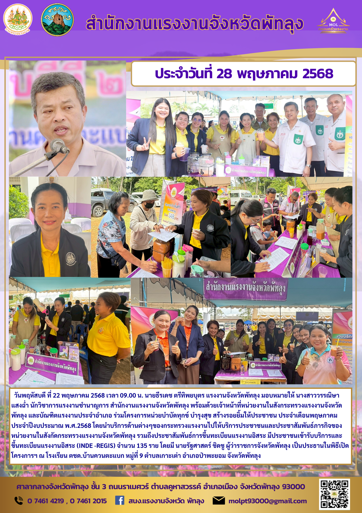 วันพฤหัสบดี ที่ 22 พฤษภาคม 2568 เวลา 09.00 น. นายธีรเดช ตรีทิพยบุตร แรงงานจังหวัดพัทลุง มอบหมายให้ นางสาววรรณิษา แสงฉ่ำ นักวิชาการแรงงานชำนาญการ สำนักงานแรงงานจังหวัดพัทลุง พร้อมด้วยเจ้าหน้าที่หน่วยงานในสังกระทรวงแรงงานจังหวัดพัทลุง และบัณฑิตแรงงานประจำอำเภอ ร่วมโครงการหน่วยบำบัดทุกข์ บำรุงสุข สร้างรอยยิ้มให้ประชาชน ประจำเดือนพฤษภาคม ประจำปีงบประมาณ พ.ศ.2568 โดยนำบริการด้านต่างๆของกระทรวงแรงงานไปให้บริการประชาชนและประชาสัมพันธ์ภารกิจของหน่วยงานในสังกัดกระทรวงแรงงานจังหวัดพัทลุง รวมถึงประชาสัมพันธ์การขึ้นทะเบียนแรงงานอิสระ มีประชาชนเข้ารับบริการและ ขึ้นทะเบียนแรงงานอิสระ (INDE -REGIS) จำนวน 135 ราย โดยมี นายรัฐศาสตร์ ชิดชู ผู้ว่าราชการจังหวัดพัทลุง เป็นประธานในพิธีเปิดโครงการฯ ณ โรงเรียน ตชด.บ้านควนตะแบก หมู่ที่ 9 ตำบลเกาะเต่า อำเภอป่าพะยอม จังหวัดพัทลุง
