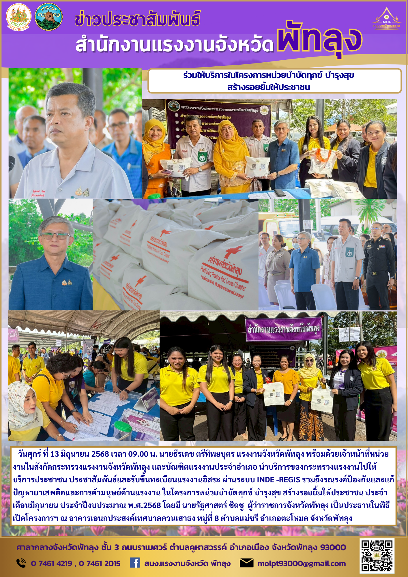 วันศุกร์ ที่ 13 มิถุนายน 2568 เวลา 09.00 น. นายธีรเดช ตรีทิพยบุตร แรงงานจังหวัดพัทลุง พร้อมด้วยเจ้าหน้าที่หน่วยงานในสังกัดกระทรวงแรงงานจังหวัดพัทลุง และบัณฑิตแรงงานประจำอำเภอ นำบริการของกระทรวงแรงงานไปให้บริการประชาชน ประชาสัมพันธ์และรับขึ้นทะเบียนแรงงานอิสระ ผ่านระบบ INDE -REGIS รวมถึงรณรงค์ป้องกันและแก้ปัญหายาเสพติดและการค้ามนุษย์ด้านแรงงาน ในโครงการหน่วยบำบัดทุกข์ บำรุงสุข สร้างรอยยิ้มให้ประชาชน ประจำเดือนมิถุนายน ประจำปีงบประมาณ พ.ศ.2568 โดยมี นายรัฐศาสตร์ ชิดชู ผู้ว่าราชการจังหวัดพัทลุง เป็นประธานในพิธีเปิดโครงการฯ ณ อาคารเอนกประสงค์เทศบาลควนเสาธง หมู่ที่ 8 ตำบลแม่ขรี อำเภอตะโหมด จังหวัดพัทลุง