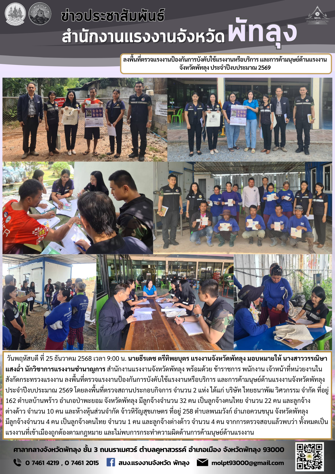 วันพฤหัสบดี ที่ 25 ธันวาคม 2568 เวลา 9:00 น. นายธีรเดช ตรีทิพยบุตร แรงงานจังหวัดพัทลุง มอบหมายให้ นางสาววรรณิษา แสงฉ่ำ นักวิชาการแรงงานชำนาญการ สำนักงานแรงงานจังหวัดพัทลุง พร้อมด้วย ข้าราชการ พนักงาน เจ้าหน้าที่หน่วยงานในสังกัดกระทรวงแรงงาน ลงพื้นที่ตรวจแรงงานป้องกันการบังคับใช้แรงงานหรือบริการ และการค้ามนุษย์ด้านแรงงานจังหวัดพัทลุง ประจำปีงบประมาณ 2569 โดยลงพื้นที่ตรวจสถานประกอบกิจการ จำนวน 2 แห่ง ได้แก่ บริษัท ไทยธนาพัฒ วิศวกรรม จำกัด ที่อยู่ 162 ตำบลบ้านพร้าว อำเภอป่าพะยอม จังหวัดพัทลุง มีลูกจ้างจำนวน 32 คน เป็นลูกจ้างคนไทย จำนวน 22 คน และลูกจ้างต่างด้าว จำนวน 10 คน และห้างหุ้นส่วนจำกัด จ้าวหิรัญสุขเกษตร ที่อยู่ 258 ตำบลพนมวังก์ อำเภอควนขนุน จังหวัดพัทลุง มีลูกจ้างจำนวน 4 คน เป็นลูกจ้างคนไทย จำนวน 1 คน และลูกจ้างต่างด้าว จำนวน 4 คน จากการตรวจสอบแล้วพบว่า ทั้งหมดเป็นแรงงานที่เข้าเมืองถูกต้องตามกฎหมาย และไม่พบการกระทำความผิดด้านการค้ามนุษย์ด้านแรงงาน