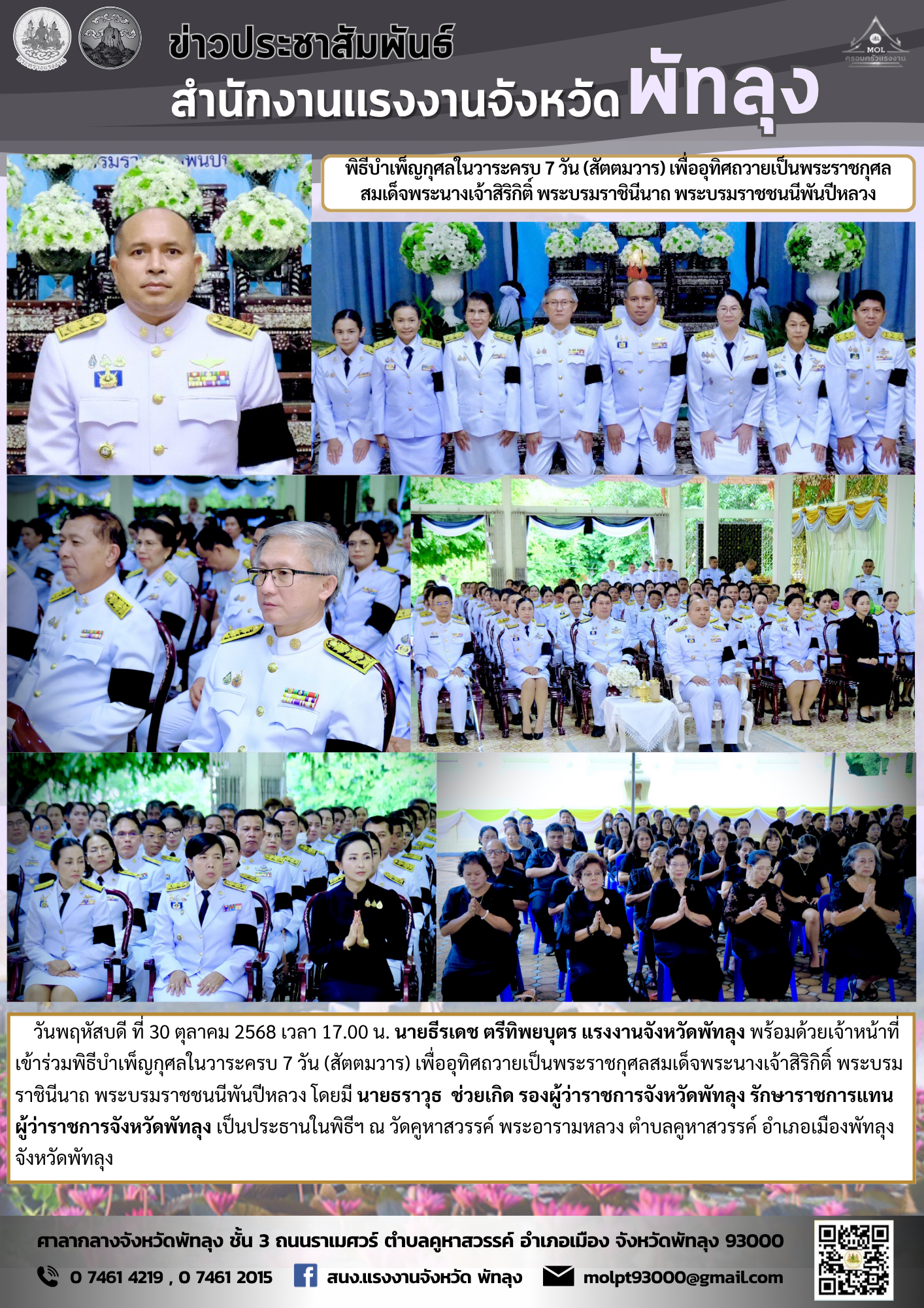 วันพฤหัสบดี ที่ 30 ตุลาคม 2568 เวลา 17.00 น. นายธีรเดช ตรีทิพยบุตร แรงงานจังหวัดพัทลุง พร้อมด้วยเจ้าหน้าที่ เข้าร่วมพิธีบำเพ็ญกุศลในวาระครบ 7 วัน (สัตตมวาร) เพื่ออุทิศถวายเป็นพระราชกุศลสมเด็จพระนางเจ้าสิริกิติ์ พระบรมราชินีนาถ พระบรมราชชนนีพันปีหลวง โดยมี นายธราวุธ ช่วยเกิด รองผู้ว่าราชการจังหวัดพัทลุง รักษาราชการแทนผู้ว่าราชการจังหวัดพัทลุง เป็นประธานในพิธีฯ ณ วัดคูหาสวรรค์ พระอารามหลวง ตำบลคูหาสวรรค์ อำเภอเมืองพัทลุง จังหวัดพัทลุง