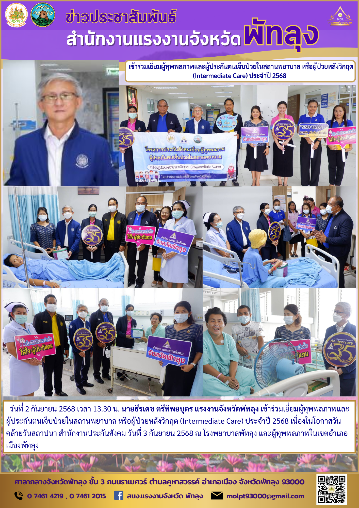 วันที่ 2 กันยายน 2568 เวลา 13.30 น. นายธีรเดช ตรีทิพยบุตร แรงงานจังหวัดพัทลุง เข้าร่วมเยี่ยมผู้ทุพพลภาพและ ผู้ประกันตนเจ็บป่วยในสถานพยาบาล หรือผู้ป่วยหลังวิกฤต (Intermediate Care) ประจำปี 2568 เนื่องในโอกาสวันคล้ายวันสถาปนา สำนักงานประกันสังคม วันที่ 3 กันยายน 2568 ณ โรงพยาบาลพัทลุง และผู้ทุพพลภาพในเขตอำเภอเมืองพัทลุง