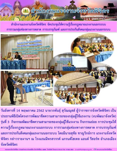 สำนักงานแรงงานจังหวัดพิจิตร จัดประชุมให้ความรู้เรื่องกฎหมายแรงงานนอกระบบการรวมกลุ่มช่องทางการตลาด การบรรจุภัณฑ์ และการประกันสังคมกลุ่มแรงงานนอกระบบ
