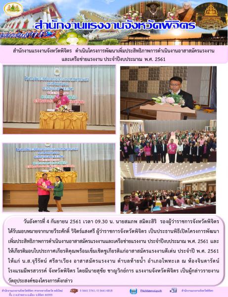 วันอังคารที่ 4 กันยายน 2561 เวลา 09.30 น. นายสมภพ สมิตะสิริ รองผู้ว่าราชการจังหวัดพิจิตร ได้รับมอบหมายจากนายวีระศักดิ์ วิจิตร์แสงศรี ผู้ว่าราชการจังหวัดพิจิตร เป็นประธานพิธีเปิดโครงการพัฒนา เพิ่มประสิทธิภาพการดำเนินงานอาสาสมัครแรงงานและเครือข่ายแรงงาน ประจำปีงบประมาณ พ.ศ. 2561 และให้เกียรติมอบใบประกาศเกียรติคุณพร้อมเข็มเชิดชูเกียรติแก่อาสาสมัครแรงงานดีเด่น ประจำปี พ.ศ. 2561 ให้แก่ น.ส.จุรีรัตน์ ศรีลาเวียง อาสาสมัครแรงงาน ตำบลท้ายน้ำ อำเภอโพทะเล ณ ห้องจินดารัตน์ โรงแรมมีพรสวรรค์ จังหวัดพิจิตร โดยมีนายสุชัย ชาญวิกย์การ แรงงานจังหวัดพิจิตร เป็นผู้กล่าวรายงานวัตถุประสงค์ของโครงการดังกล่าว
