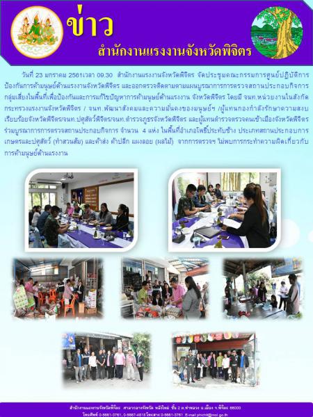 วันที่ 23 มกราคม 2561เวลา 09.30 สำนักงานแรงงานจังหวัดพิจิตร จัดประชุมคณะกรรมการศูนย์ปฏิบัติการป้องกันการค้ามนุษย์ด้านแรงงานจังหวัดพิจิตร และออกตรวจติดตามตามแผนบูรณาการการตรวจสถานประกอบกิจการกลุ่มเสี่ยงในพื้นที่เพื่อป้องกันและการแก้ไขปัญหาการค้ามนุษย์ด้านแรงงาน จังหวัดพิจิตร โดยมี จนท.หน่วยงานในสังกัดกระทรวงแรงงานจังหวัดพิจิตร / จนท.พัฒนาสังคมและความมั่นคงของมนุษย์ฯ /ผู้แทนกองกำลังรักษาความสงบเรียบร้อยจังหวัดพิจิตร/จนท.ปศุสัตว์พิจิตร/จนท.ตำรวจภูธรจังหวัดพิจิตร และผู้แทนตำรวจตรวจคนเข้าเมืองจังหวัดพิจิตร ร่วมบูรณาการการตรวจสถานประกอบกิจการ จำนวน 4 แห่ง ในพื้นที่อำเภอโพธิ์ประทับช้าง ประเภทสถานประกอบการเกษตรและปศุสัตว์ (ทำสวนส้ม) และค้าส่ง ค้าปลีก แผงลอย (ผลไม้) จากการตรวจฯ ไม่พบการกระทำความผิดเกี่ยวกับการค้ามนุษย์ด้านแรงงาน