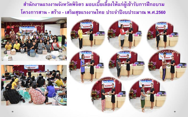 วันที่ 2 พฤษภาคม 2560 นายมนต์ชัย เดชพล แรงงานจังหวัดพิจิตร มอบหมายให้นางสาวเยี่ยมวิมล พาอินทร์ นักวิชาการแรงงานชำนาญการ มอบเบี้ยเลี้ยงให้แก่ผู้เข้ารับการฝึกอบรมตามโครงการสาน – สร้าง – เสริมสุขแรงงานไทย ประจำปีงบประมาณ พ.ศ.2560 กิจกรรม ส่งเสริมเพื่อพัฒนาแรงงานนอกระบบให้เข้มแข็ง หลักสูตร การฝึกอบรมสานตะกร้าด้วยเส้นพลาสติกและเดคูพาจ ระหว่างวันที่ 27 เมษายน – 1 พฤษภาคม 2560 ณ องค์การบริหารส่วนตำบลท้ายน้ำ อำเภอโพทะเล จังหวัดพิจิตร