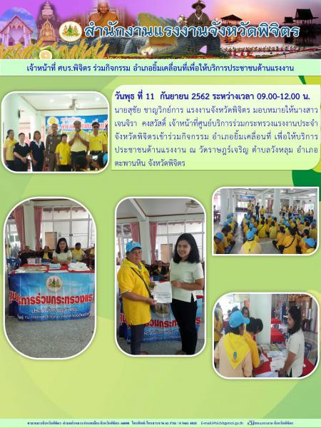 สำนักงานแรงงานจังหวัดพิจิตร ร่วมกับเจ้าหน้าที่ ศบร.พิจิตร ร่วมกิจกรรม อำเภอยิ้มเคลื่อนที่เพื่อให้บริการประชาชนด้านแรงงาน ณ วัดราษฎร์เจริญ ตำบลวังหลุม อำเภอตะพานหิน จังวัดพิจิตร