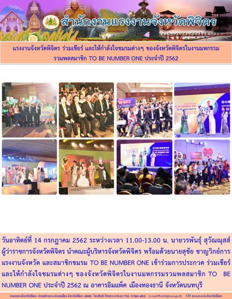 วันอาทิตย์ที่ 14 กรกฎาคม 2562 ระหว่างเวลา 11.00-13.00 น. นายวรพันธุ์ สุวัณณุสส์ ผู้ว่าราชการจังหวัดพิจิตร นำคณะผู้บริหารจังหวัดพิจิตร พร้อมด้วยนายสุชัย ชาญวิกย์การ แรงงานจังหวัด และสมาชิกชมรม TO BE NUMBER ONE เข้าร่วมการประกวด ร่วมเชียร์ และให้กำลังใจชมรมต่างๆ ของจังหวัดพิจิตรในงานมหกรรมรวมพลสมาชิก TO BE NUMBER ONE ประจำปี 2562 ณ อาคารอิมแพ็ค เมืองทองธานี จังหวัดนนทบุรี