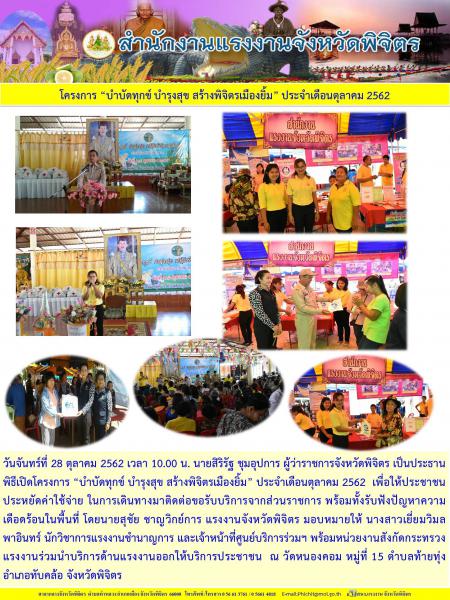 สำนักงานแรงงานจังหวัดพิจิตร ร่วม โครงการ “บำบัดทุกข์ บำรุงสุข สร้างพิจิตรเมืองยิ้ม” ประจำเดือนตุลาคม 2562 ณ วัดหนองคอม หมู่ที่ 15 ตำบลท้ายทุ่ง อำเภอทับคล้อ จังหวัดพิจิตร