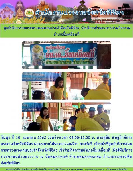 สำนักงานแรงงานจังหวัดพิจิตร ศูนย์บริการร่วมกระทรวงแรงงานประจำจังหวัดพิจิตร นำบริการด้านแรงงานร่วมกิจกรรมอำเภอยิ้มเคลื่อนที่ ณ วัดหนองพงษ์ ตำบลหนองพะยอม อำเภอตาพานหิน จังหวัดพิจิตร