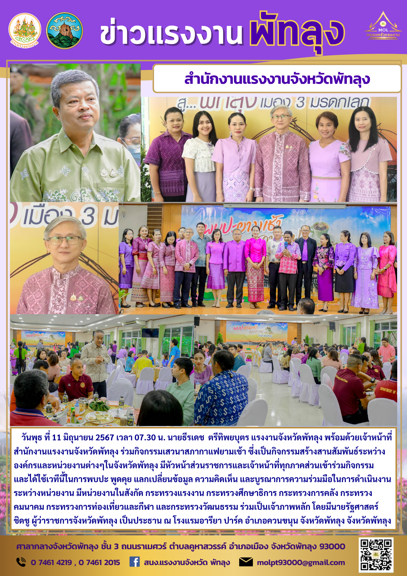 วันพุธ ที่ 11 มิถุนายน 2567 เวลา 07.30 น. นายธีรเดช ตรีทิพยบุตร แรงงานจังหวัดพัทลุง พร้อมด้วยเจ้าหน้าที่สำนักงานแรงงานจังหวัดพัทลุง ร่วมกิจกรรมเสวนาสภากาแฟยามเช้า ซึ่งเป็นกิจกรรมสร้างสานสัมพันธ์ระหว่างองค์กรและหน่วยงานต่างๆในจังหวัดพัทลุง มีหัวหน้าส่วนราชการและเจ้าหน้าที่ทุกภาคส่วนเข้าร่วมกิจกรรม และได้ใช้เวทีนี้ในการพบปะ พูดคุย แลกเปลี่ยนข้อมูล ความคิดเห็น และบูรณาการความร่วมมือในการดำเนินงานระหว่างหน่วยงาน มีหน่วยงานในสังกัด กระทรวงแรงงาน กระทรวงศึกษาธิการ กระทรวงการคลัง กระทรวงคมนาคม กระทรวงการท่องเที่ยวและกีฬา และกระทรวงวัฒนธรรม ร่วมเป็นเจ้าภาพหลัก โดยมีนายรัฐศาสตร์ ชิดชู ผู้ว่าราชการจังหวัดพัทลุง เป็นประธาน ณ โรงแรมอารียา ปาร์ค อำเภอควนขนุน จังหวัดพัทลุง จังหวัดพัทลุง