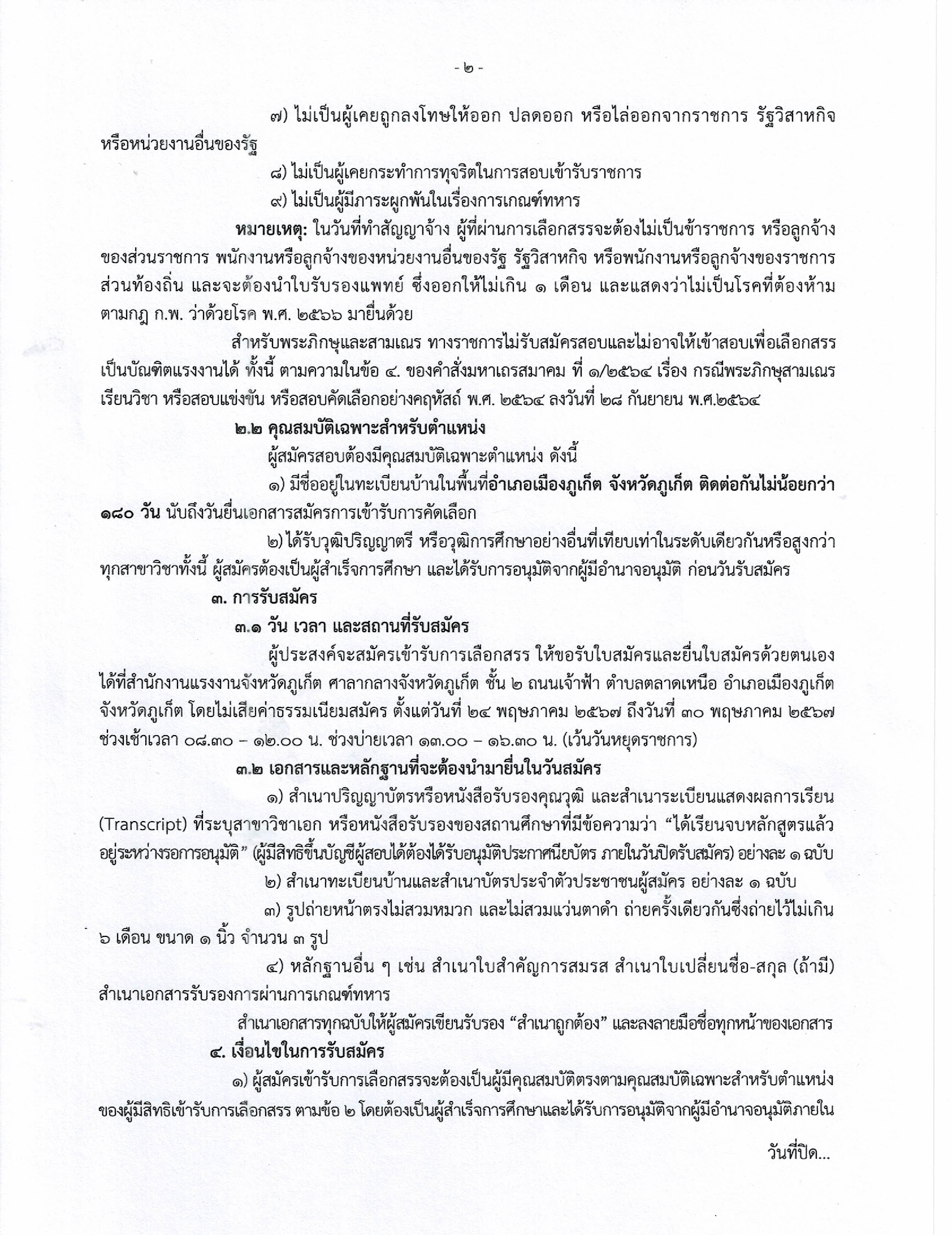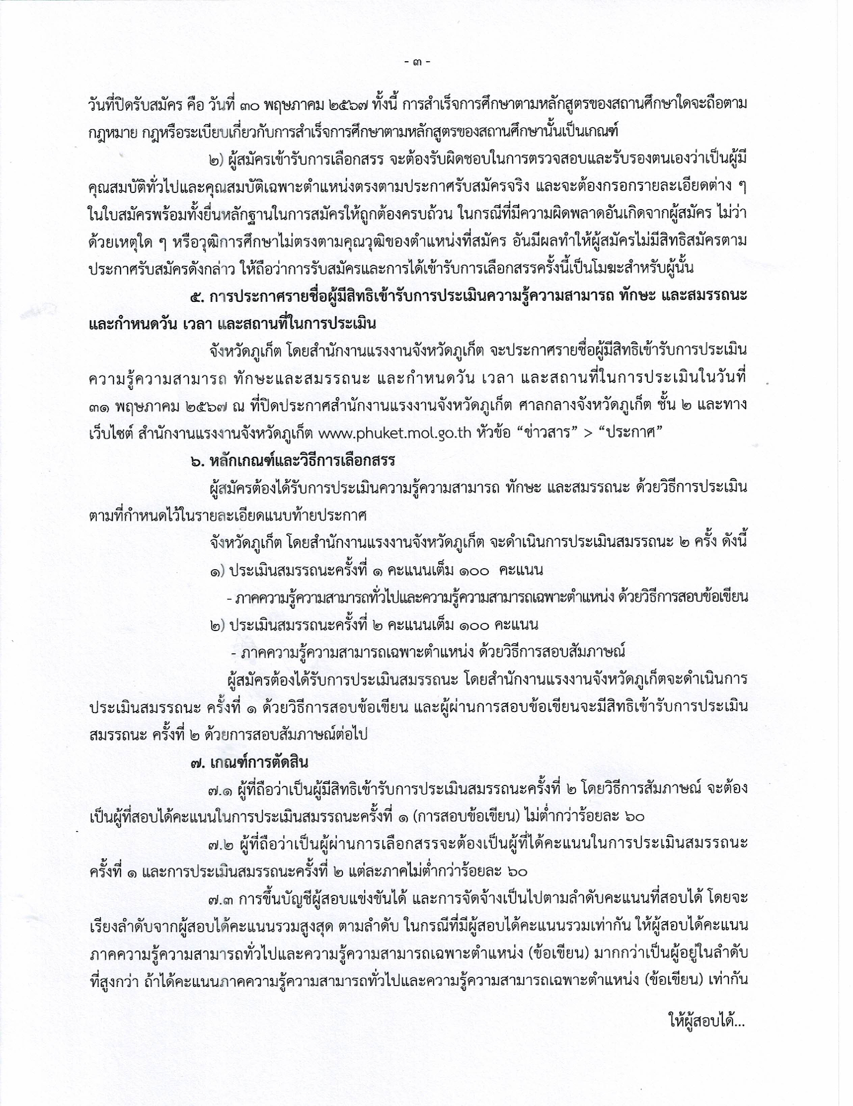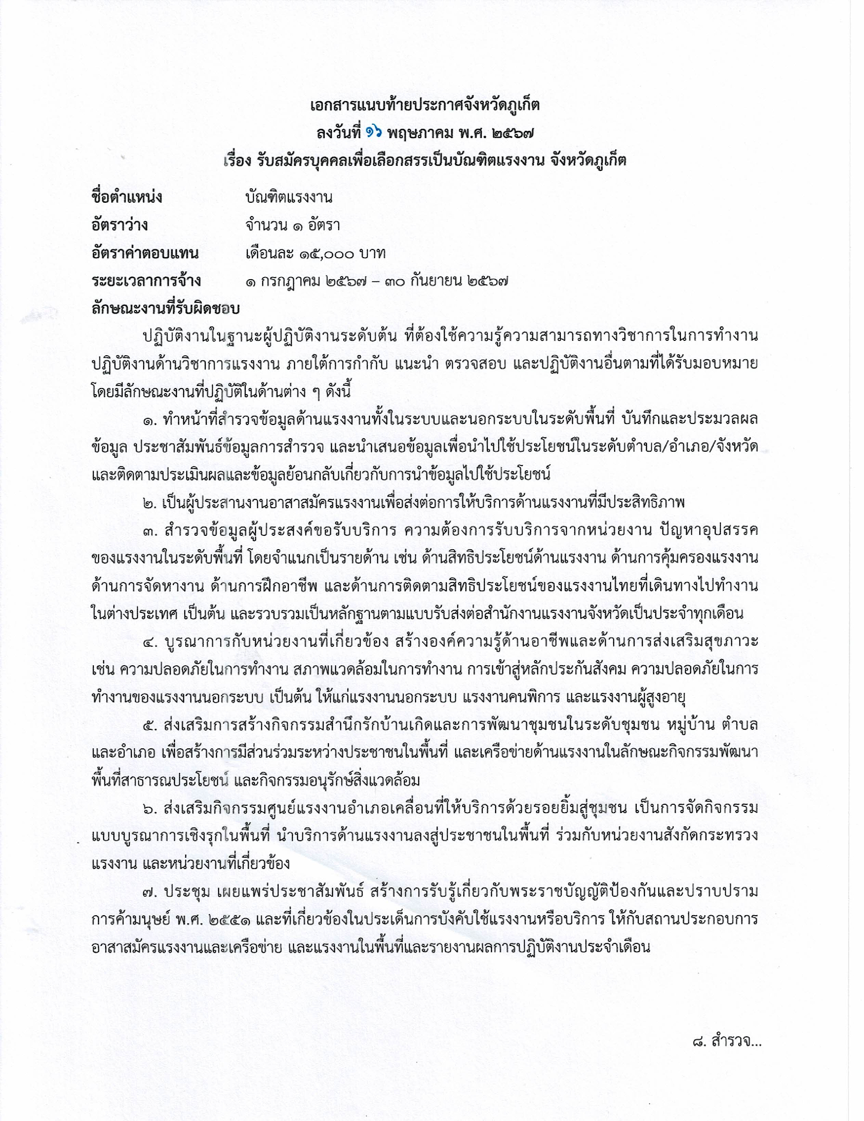 สำนักงานแรงงานจังหวัดภูเก็ต ประกาศรับสมัครบุคคลเพื่อเลือกสรรบุคคลเป็นบัณฑิตแรงงาน จังหวัดภูเก็ต จำนวน 1 อัตรา ค่าจ้างเดือนละ 15,000 บาท ระยะเวลาการจ้าง 3 เดือน