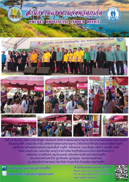 เมื่อวันที่ 22 ธันวาคม 2561 นางสาวณฐยา พันธ์พงศ์ นักวิชาการแรงงานชำนาญการ รักษาราชการแทนแรงงานจังหวัดภูเก็ต ได้มอบหมายให้ นายนราธิป ตาปิน นักวิชาการแรงงานชำนาญการ นำทีมเจ้าหน้าที่สำนักงานแรงงานจังหวัดภูเก็ต ออกให้บริการด้านแรงงานแก่ประชาชนในพื้นที่ จ.ภูเก็ต ในโครงการ “อบจ.สัญจร ครั้งที่ 5 ประจำปี 2561” โดยมี นายประกอบ วงศมณีรุ่ง รองผู้ว่าราชการจังหวัดภูเก็ตเป็นประธานในการเปิดโครงการ ฯ พร้อมด้วย นายวัชรินทร์ ปฐมวัฒนพงศ์ ปลัดองค์การบริหารส่วนจังหวัดภูเก็ต คณะเทศบาลตำบลราไวย์ ผู้นำท้องถิ่น ผู้นำชุมชน และประชาชนเข้าร่วม ณ บริเวณวัดสว่างอารมณ์ (วัดราไวย์) ตำบลราไวย์ อำเภอเมือง จังหวัดภูเก็ต