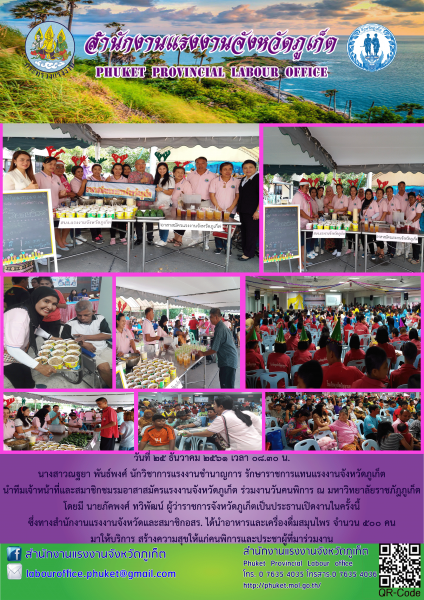 วันที่ 25 ธันวาคม 2561 เวลา 08.30 น. นางสาวณฐยา พันธ์พงศ์ นักวิชาการแรงงานชำนาญการ รักษาราชการแทนแรงงานจังหวัดภูเก็ต นำทีมเจ้าหน้าที่และสมาชิกชมรมอาสาสมัครแรงงานจังหวัดภูเก็ต ร่วมงานวันคนพิการ ณ มหาวิทยาลัยราชภัฎภูเก็ตโดยมี นายภัคพงศ์ ทวิพัฒน์ ผู้ว่าราชการจังหวัดภูเก็ตเป็นประธานเปิดงานในครั้งนี้ ซึ่งทางสำนักงานแรงงานจังหวัดและสมาชิกอสร. ได้นำอาหารและเครื่องดื่มสมุนไพร จำนวน 500 คน มาให้บริการ สร้างความสุขให้แก่คนพิการและประชาผู้ที่มาร่วมงาน