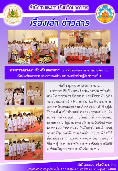 สำนักงานแรงงานจังหวัดมุกดาหาร ร่วมพิธีวางพวงมาลาถวายราชสักการะ เนื่องในวันสวรรต พระบาทสมเด็จพระจอมเกล้าเจ้าอยู่หัว รัชการที่ 4 ณ ห้องแก้วมุกดา ศาลากลางจังหวัดมุกดาหาร
