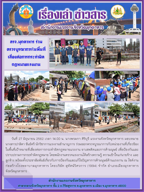 สำนักงานแรงงานจังหวัดมุกดาหาร ร่วมออกตรวจบูรณาการกับหน่วยงานที่เกี่ยวข้องในพื้นที่เป้าหมายที่เสี่ยงต่อการกระทำความผิดกฎหมายแรงงาน ยาเสพติดและการค้ามนุษย์ เพื่อป้องกันและปราบปรามการกระทำผิดกฎหมาย