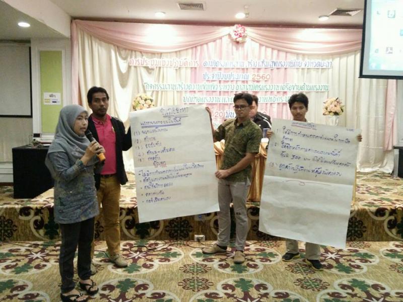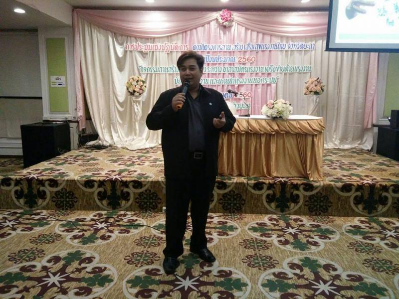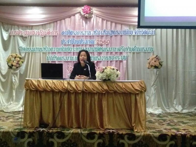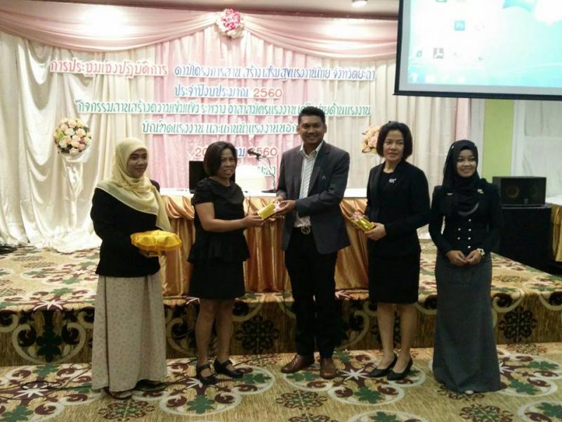 วันที่ ๒๐ มีนาคม ๒๕๖๐ สำนักงานแรงงานจังหวัดยะลา จัดโครงการสานสร้างเสริมสุขแรงงานไทย ร่วมกับหน่วยงานในสังกัดกระทรวงแรงงานจังหวัดยะลา "กิจกรรมสานสร้างความเข้มแข็งระหว่างอาสาสมัครแรงงานเครือข่ายด้านแรงงาน บัณฑิตแรงงานและแกนนำแรงงานนอกระบบ" ดำเนินรายการโดย นายธนัตถ์ ช่างสาน นักวิชาการแรงงานชำนาญการ สำนักงานสวัสดิการและคุ้มครองแรงงานจังหวัดยะลา ณ โรงแรมปาร์ควิว ยะลา อำเภอเมือง จังหวัดยะลา