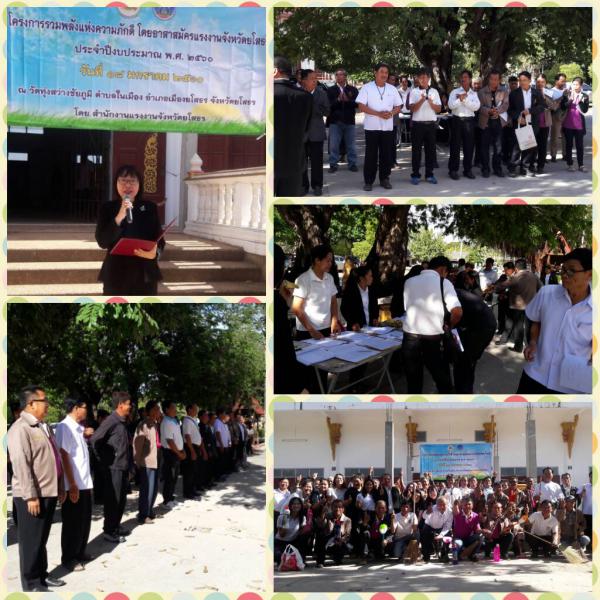 วันนี้ (18 มกราคม 2560) แรงงานจังหวัดยโสธร(นางอรวรรณ หินตะ) พร้อมด้วยหัวหน้าส่วนราชการ เจ้าหน้าที่หน่วยงานสังกัดกระทรวงแรงงาน พี่เลี้ยงอาสาสมัครแรงงาน จัดโครงการรวมพลังแห่งควาามภักดี โดยอาสาสมัครแรงงานจังหวัดยโสธร ประจำปีงบประมาณ พ.ศ. 2560 โดยมีวัตถุประสงค์เพื่อให้อาสาสมัครแรงงานได้ร่วมกับภาคีในชุมชนทุกภาคส่วน ทั้งภาครัฐ/เอกชน/ประชาชนทั่วไป ได้บำเพ็ญประโยชน์เพื่อสาธารณะผ่านการทำกิจกรรมร่วมกัน เพื่อถวายเป็นพระราชกุศลแด่พระบาทสมเด็จพระปรมินทรมหาภูมิพลอ ดุลยเดช มหิตลาธิเบศรามาธิบดีจักรีนฤบดินทร สยามมินทราธิราช บรมนาถบพิตร ได้จัดกิจกรรมบำเพ็ญประโยชน์ทำความสะอาดบริเวณวัดและถวายภัตตาหารเพลแด่ พระสงฆ์ ณ วัดทุุ่งสว่างชัยภูมิ ต.ในเมือง อ.เมืองยโสธร จ.ยโสธร