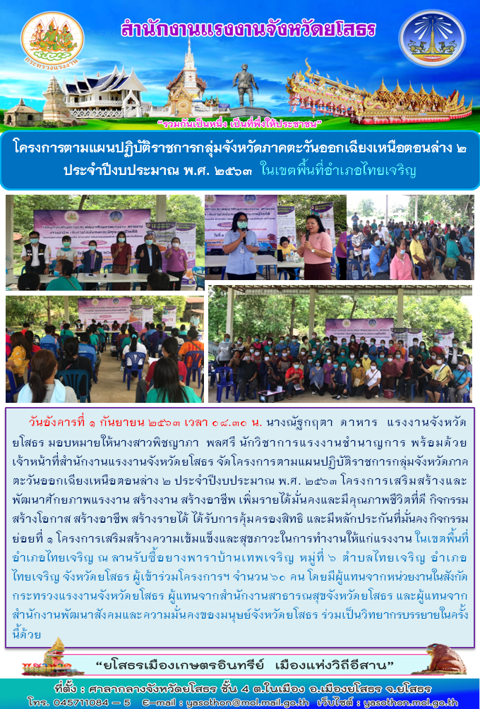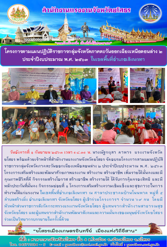สำนักงานแรงงานจังหวัดยโสธร จัดโครงการตามแผนปฏิบัติราชการกลุ่มจังหวัดภาคตะวันออกเฉียงเหนือตอนล่าง 2 ประจำปีงบประมาณ พ.ศ. 2563 ในเขตพื้นที่อำเภอไทยเจริญและในเขตพื้นที่อำเภอเลิงนกทา