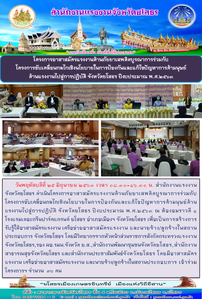 สำนักงานแรงงานจังหวัดยโสธร จัดโครงการอาสาสมัครแรงงานต้านภัยยาเสพติดบูรณาการร่วมกับโครงการขับเคลื่อนกลไกเชิงนโยบายในการป้องกันและแก้ไขปัญหาการค้ามนุษย์ด้านแรงงานไปสู่การปฏิบัติ จังหวัดยโสธร ปีงบประมาณ พ.ศ.2563