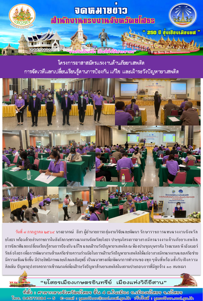 สำนักงานแรงงานจังหวัดยโสธร จัดโครงการอาสาสมัครแรงงานต้านภัยยาเสพติด การจัดเวทีแลกเปลี่ยนเรียนรู้ดานการป้องกัน แก้ไข และเฝ้าระวังปัญหายาเสพติด ณ ห้องประชุมบุษราคัม โรงแรมเจ พี เอ็มเมอร์รัลด์ ยโสธร