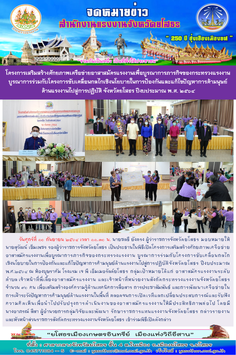 สำนักงานแรงงานจังหวัดยโสธร จัดโครงการเสริมสร้างศักยภาพเครือข่ายอาสาสมัครแรงงานเพื่อบูรณาการภารกิจของกระทรวงแรงงาน บูรณาการร่วมกับโครงการขับเคลื่อนกลไกเชิงนโยบายในการป้องกันและแก้ไขปัญหาการค้ามนุษย์ ด้านแรงงานไปสู่การปฏิบัติ จังหวัดยโสธร ปีงบประมาณ พ.ศ. ๒๕๖๔