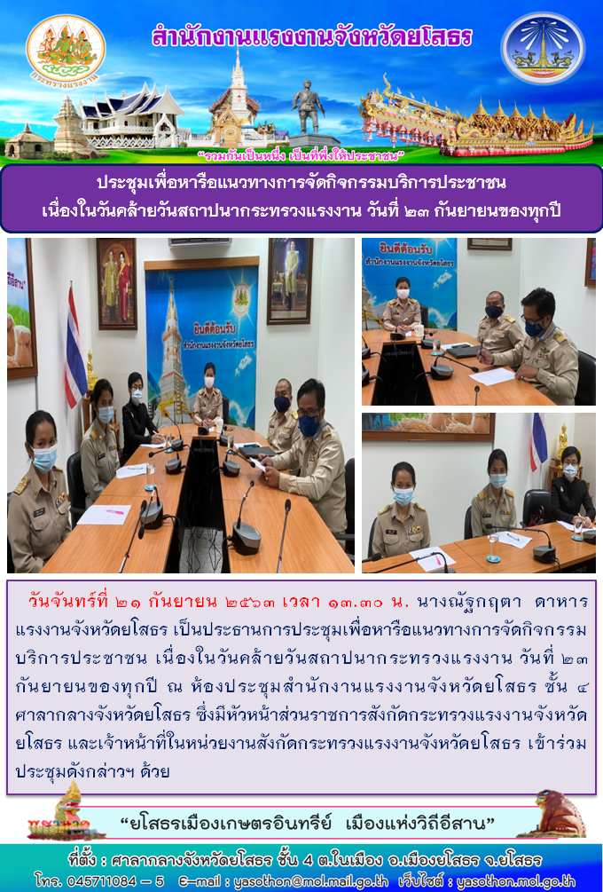 สำนักงานแรงงานจังหวัดยโสธร ประชุมเพื่อหารือแนวทางการจัดกิจกรรมบริการประชาชน เนื่องในวันคล้ายวันสถาปนากระทรวงแรงงาน วันที่ 23 กันยายนของทุกปี