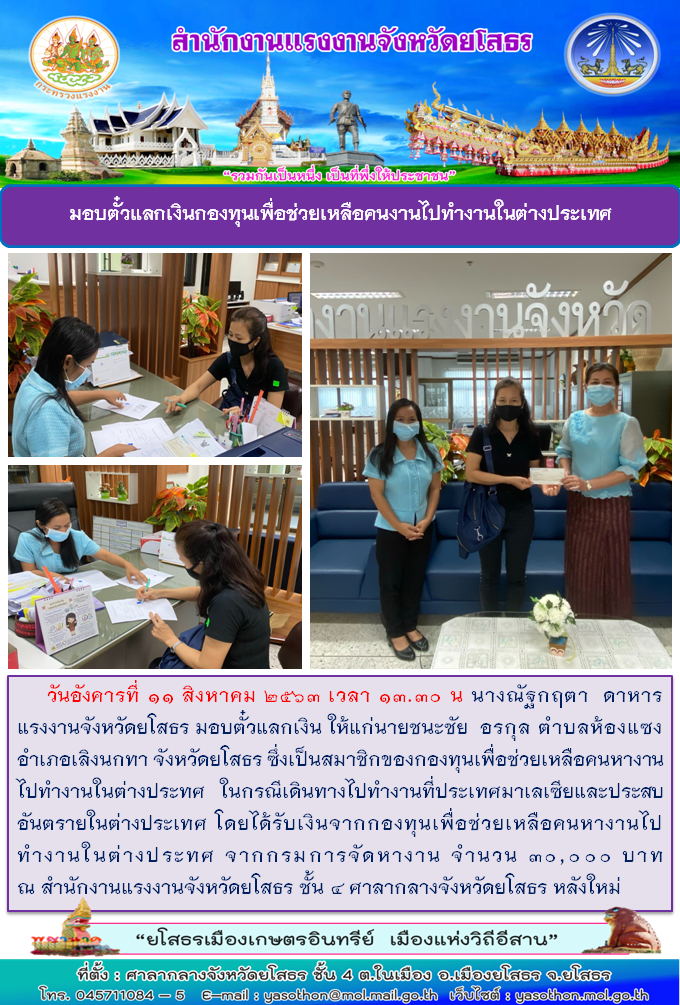 สำนักงานแรงงานจังหวัดยโสธร มอบตั๋วแลกเงินกองทุนเพื่อช่วยเหลือคนงานไปทำงานในต่างประเทศ