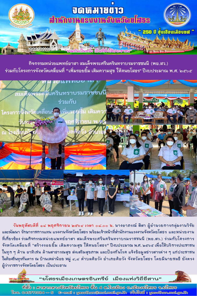 สำนักงานแรงงานจังหวัดยโสธร ร่วมกิจกรรมหน่วยแพทย์อาสา สมเด็จพระศรีนครินทราบรมราชชนนี (พอ.สว.) ร่วมกับโครงการจังหวัดเคลื่อนที่ “เพิ่มรอยยิ้ม เติมความสุข ให้คนยโสธร” ปีงบประมาณ พ.ศ.2565