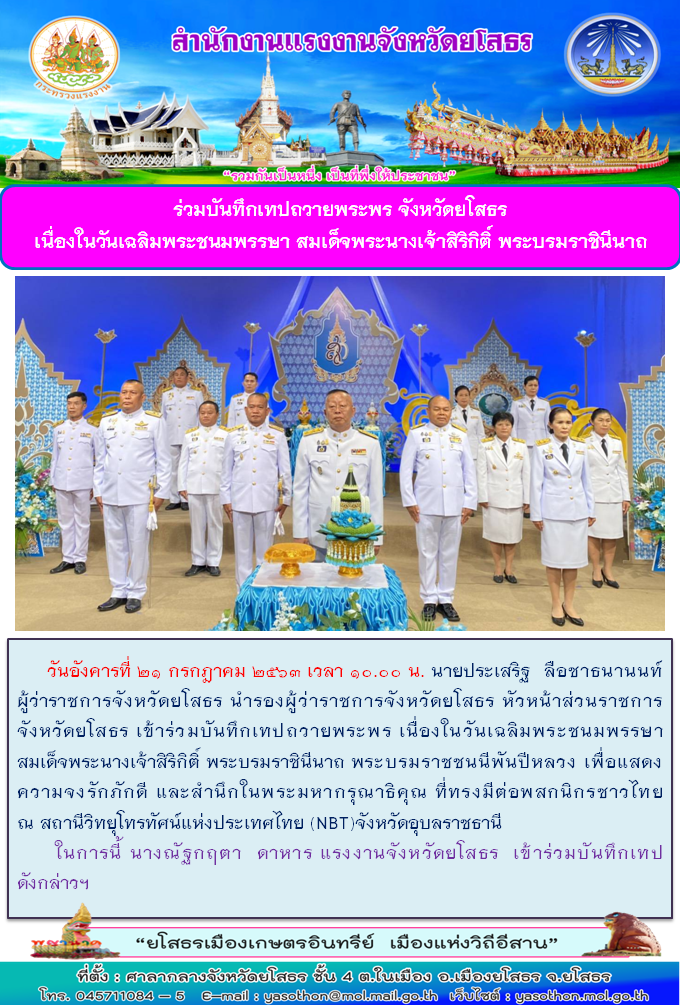 สำนักงานแรงงานจังหวัดยโสธร ร่วมบันทึกเทปถวายพระพร จังหวัดยโสธร เนื่องในวันเฉลิมพระชนมพรรษา สมเด็จพระนางเจ้าสิริกิติ์ พระบรมราชินีนาถ