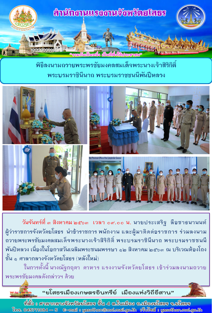 สำนักงานแรงงานจังหวัดยโสธร ร่วมพิธีลงนามถวายพระพรชัยมงคลสมเด็จพระนางเจ้าสิริกิติ์ พระบรมราชินีนาถ พระบรมราชชนนีพันปีหลวง
