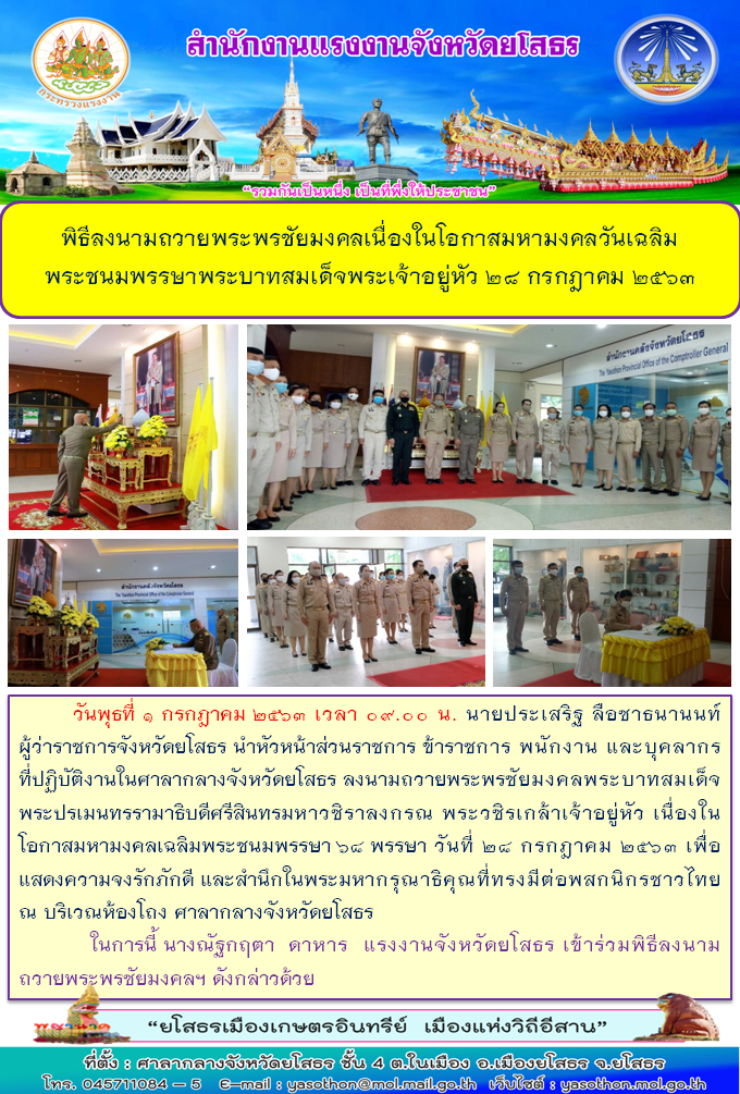 สำนักงานแรงงานจังหวัดยโสธร ร่วมพิธีลงนามถวายพระพรชัยมงคลเนื่องในโอกาสมหามงคลวันเฉลิม พระชนมพรรษาพระบาทสมเด็จพระเจ้าอยู่หัว 28 กรกฎาคม 2563