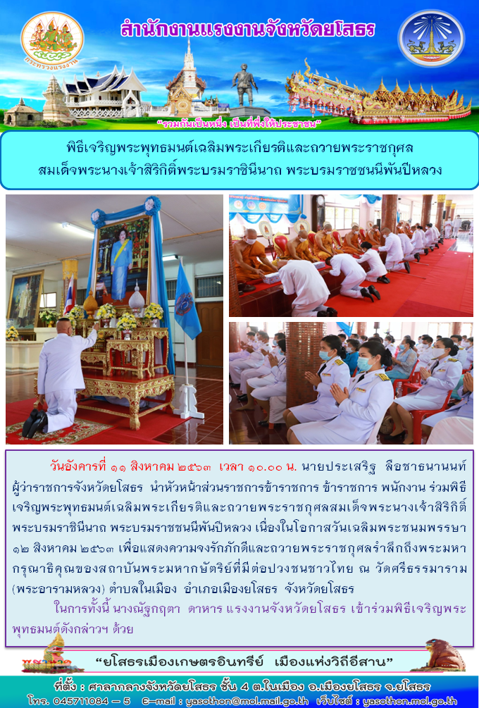 สำนักงานแรงงานจังหวัดยโสธร ร่วมพิธีเจริญพระพุทธมนต์เฉลิมพระเกียรติและถวายพระราชกุศล สมเด็จพระนางเจ้าสิริกิติ์พระบรมราชินีนาถ พระบรมราชชนนีพันปีหลวง