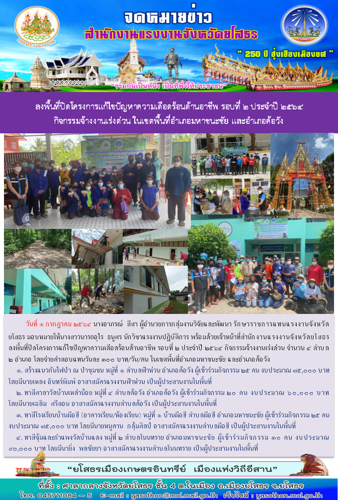 สำนักงานแรงงานจังหวัดยโสธร ลงพื้นที่ปิดโครงการแก้ไขปัญหาความเดือดร้อนด้านอาชีพ รอบที่ 2 ประจำปี 2564 กิจกรรมจ้างงานเร่งด่วน ในเขตพื้นที่อำเภอมหาชนะชัย และอำเภอค้อวัง จังหวัดยโสธร