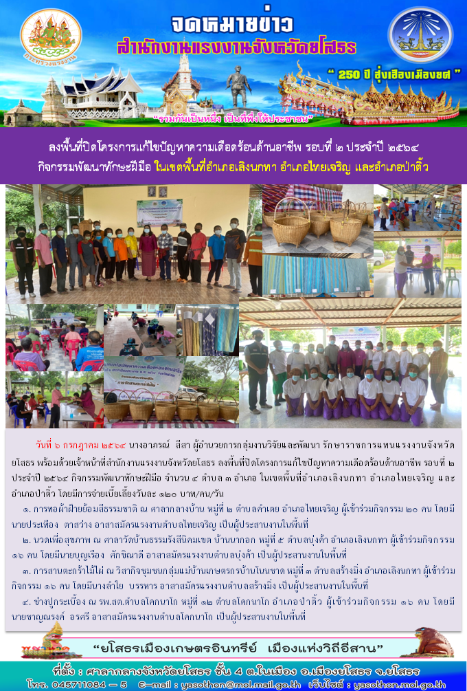สำนักงานแรงงานจังหวัดยโสธร ลงพื้นที่ปิดโครงการแก้ไขปัญหาความเดือดร้อนด้านอาชีพ รอบที่ 2 ประจำปี 2564 กิจกรรมพัฒนาทักษะฝีมือ ในเขตพื้นที่อำเภอเลิงนกทา อำเภอไทยเจริญ และอำเภอป่าติ้ว จังหวัดยโสธร