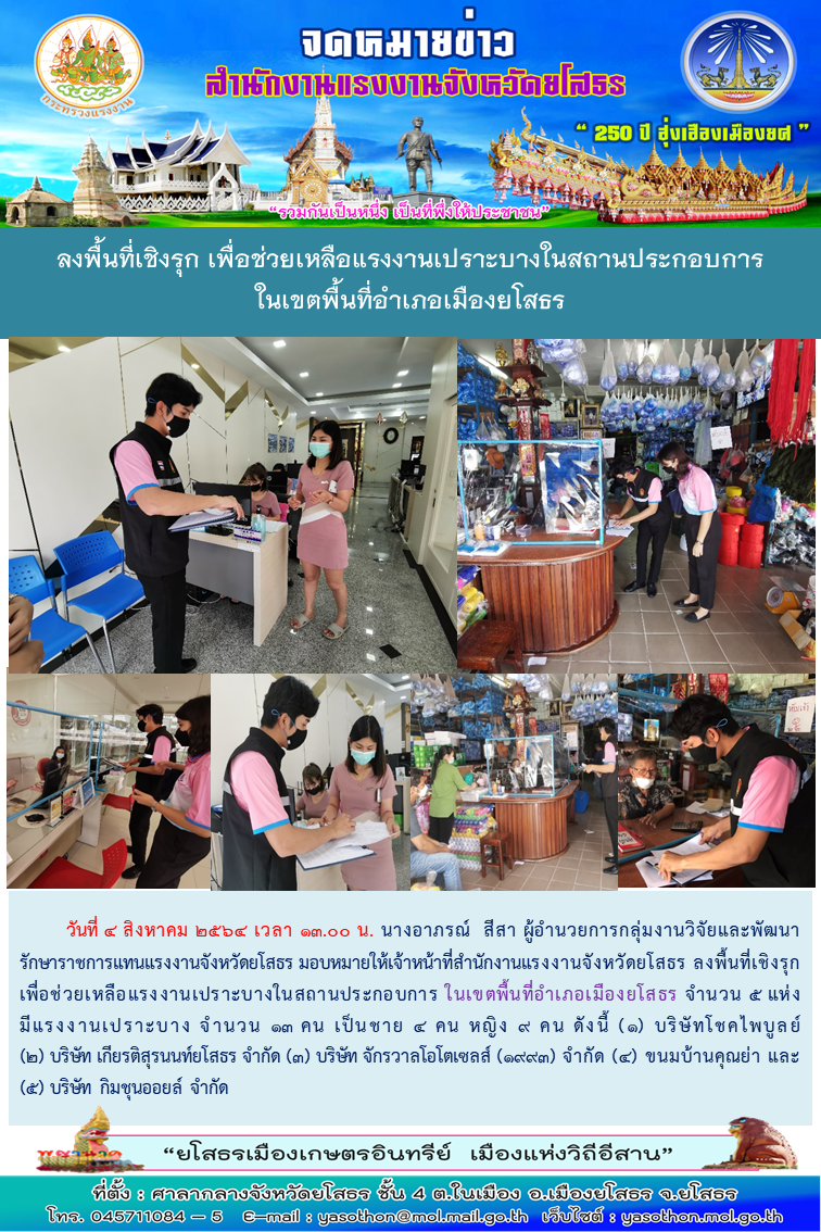 สำนักงานแรงงานจังหวัดยโสธร ลงพื้นที่เชิงรุก เพื่อช่วยเหลือแรงงานเปราะบางในสถานประกอบการ ในเขตพื้นที่อำเภอเมืองยโสธร จังหวัดยโสธร