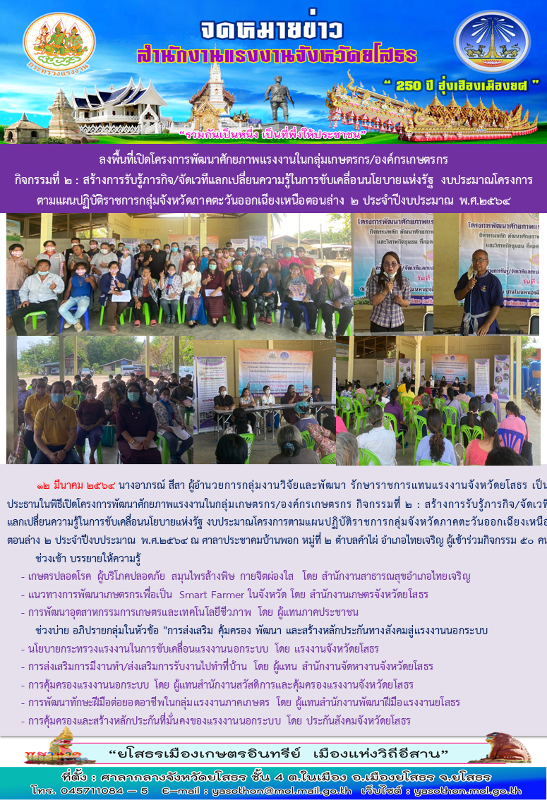 สำนักงานแรงงานจังหวัดยโสธร ลงพื้นที่เปิดโครงการพัฒนาศักยภาพแรงงานในกลุ่มเกษตรกร/องค์กรเกษตร