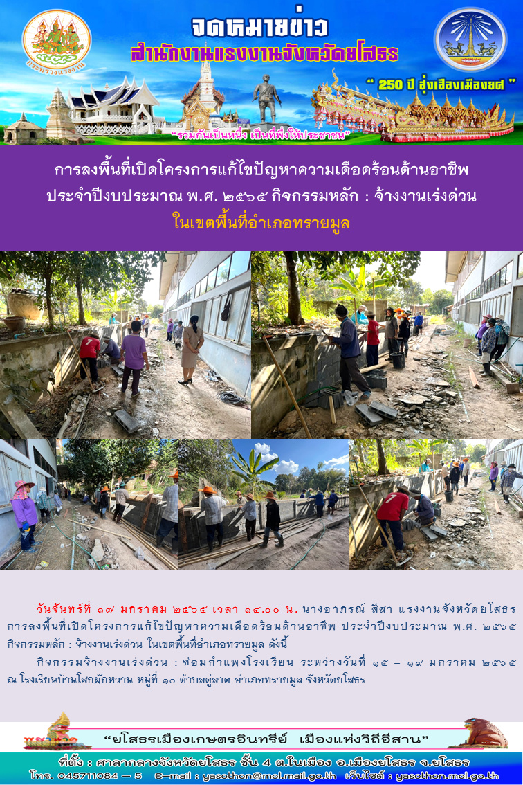 สำนักงานแรงงานจังหวัดยโสธร ลงพื้นที่โครงการแก้ไขปัญหาความเดือนร้อนด้านอาชีพ ปีงบประมาณ พ.ศ.2565 ในกิจกรรมจ้างงานเร่งด่วน ในเขตพื้นที่อำเภอทรายมูล