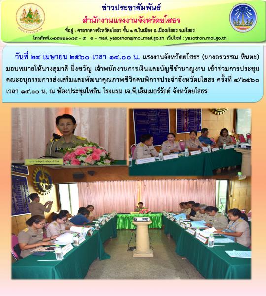 สำนักงานแรงงานจังหวัดยโสธร เข้าร่วมการประชุมคณะอนุกรรมการส่งเสริมและพัฒนาคุณภาพชีวิตคนพิการประจำจังหวัดยโสธร ครั้งที่ 4/2560