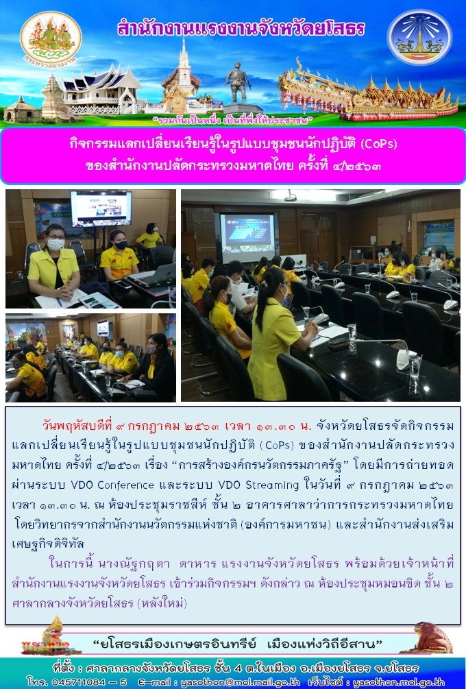 สำนักงานแรงงานจังหวัดยโสธร เข้าร่วมกิจกรรมแลกเปลี่ยนเรียนรู้ในรูปแบบชุมชนนักปฏิบัติ (CoPs) ของสำนักงานปลัดกระทรวงมหาดไทย ครั้งที่ 4/2563