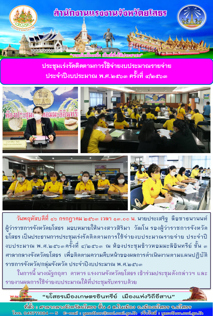 สำนักงานแรงงานจังหวัดยโสธร เข้าร่วมประชุมเร่งรัดติดตามการใช้จ่ายงบประมาณรายจ่าย ประจำปีงบประมาณ พ.ศ.2563 ครั้งที่ 4/2563