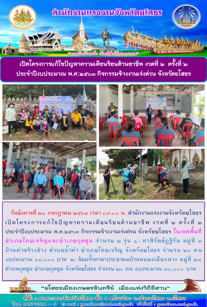 สำนักงานแรงงานจังหวัดยโสธร เปิดโครงการแก้ไขปัญหาความเดือดร้อนด้านอาชีพ งวดที่ 2 ครั้งที่ 2 ประจำปีงบประมาณ พ.ศ. 2563 กิจกรรมจ้างงานเร่งด่วน จังหวัดยโสธร