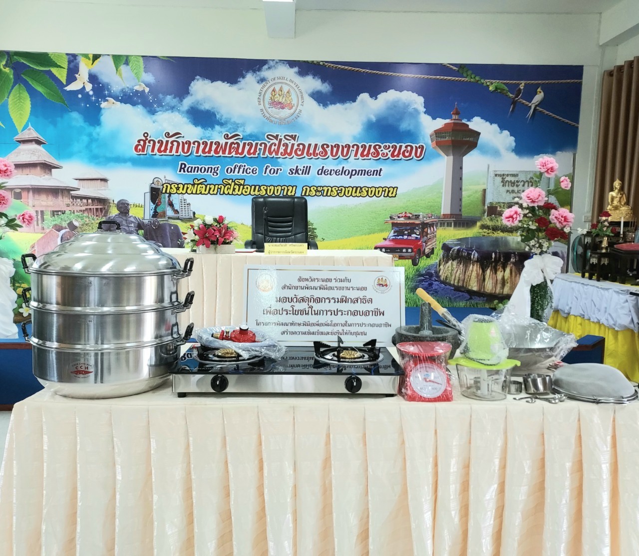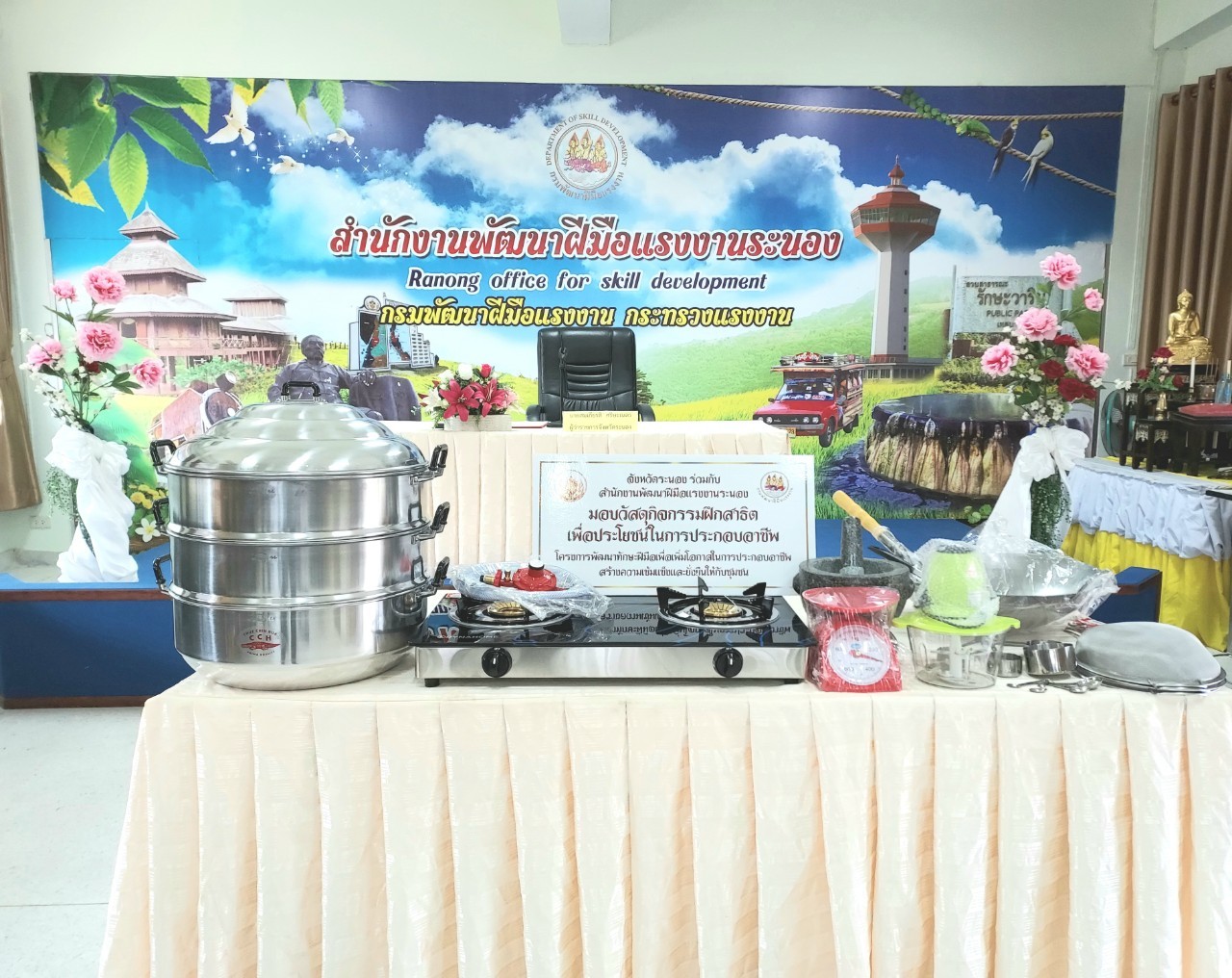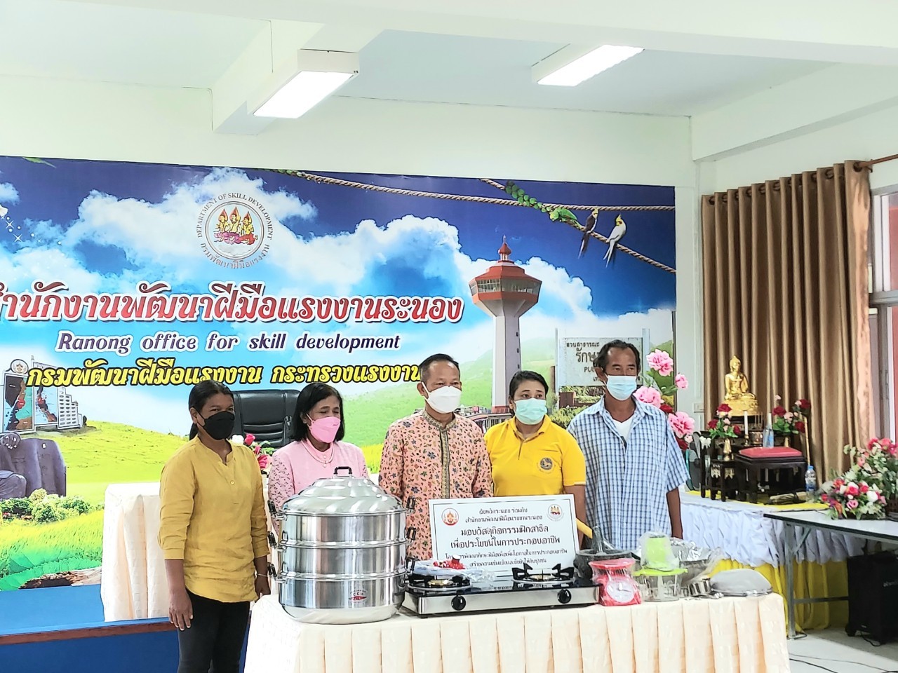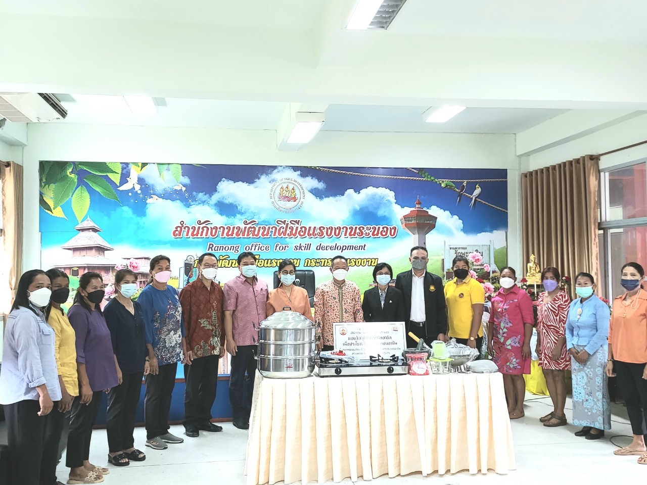 สำนักงานแรงงานจังหวัดระนองร่วมพิธีมอบอุปกรณ์เครื่องใช้ในโครงการพัฒนาทักษะฝีมือในการประกอบอาชีพสร้างความเข้มแข็งและยั่งยืน