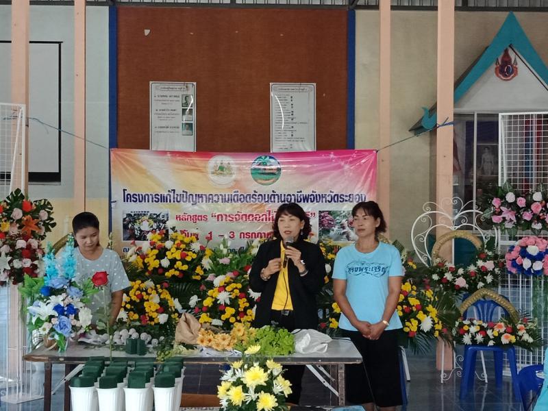 วันอังคารที่ 2 กรกฎาคม 2562 เวลา 11.00 น. นางสาวกรจิรัฏฐ์ พงจันทร์ศธร แรงงานจังหวัดระยอง ปิดโครงการแก้ไขปัญหาความเดือดร้อนด้านอาชีพจังหวัดระยอง ปีงบประมาณ พ.ศ.2562 หลักสูตรการจัดดอกไม้งานพิธี ดำเนินการฝึกระหว่างวันที่ 1-3 กรกฎาคม 2562 ณ ศาลากองทุนแม่ของแผ่นดิน บ้านชากตะไคร้ ม.7 ต.วังหว้า อ.แกลง จ.ระยอง โดยมีแรงงานนอกระบบได้รับการส่งเสริมและพัฒนาทักษะฝีมือ จำนวน 16 คน
