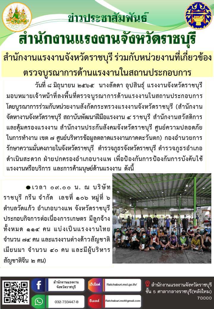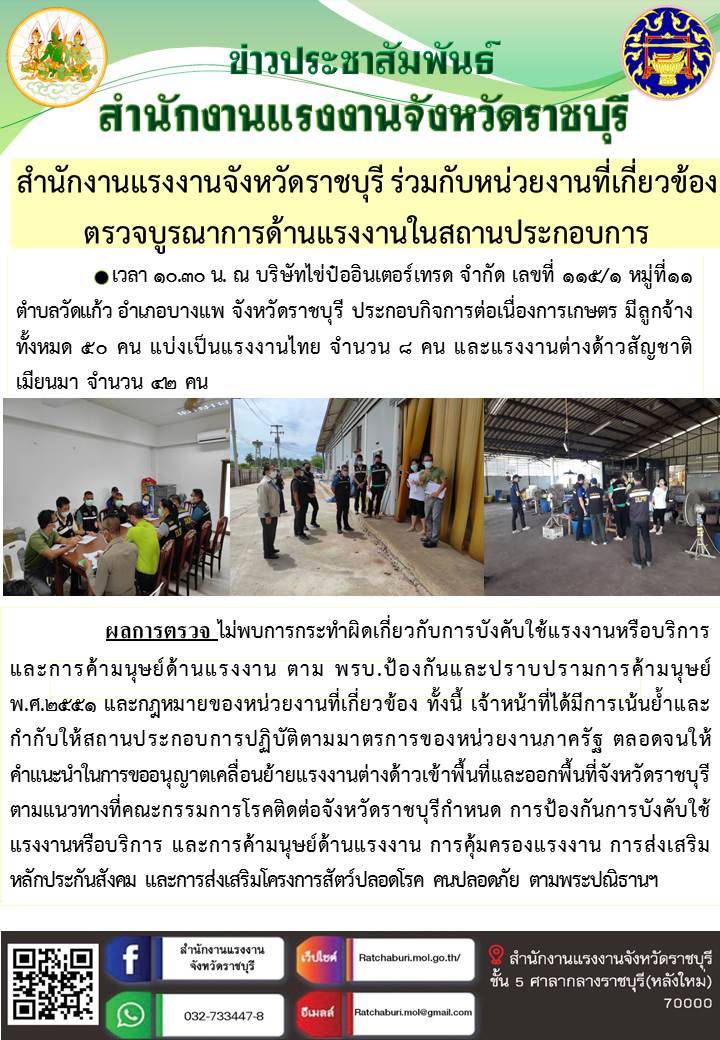 สำนักงานแรงงานจังหวัดราชบุรีร่วมกับหน่วยงานที่เกี่ยวข้องตรวจบูรณาการด้านแรงงานในสถานประกอบการ