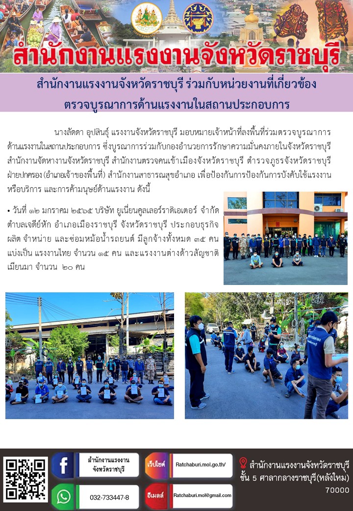 วันที่ ๑๒ มกราคม ๒๕๖๕ บริษัท ยูเนี่ยนคูลเลอร์ราดิเอเตอร์ จำกัด ตำบลเจดีย์หัก อำเภอเมืองราชบุรี จังหวัดราชบุรี ประกอบธุรกิจผลิต จำหน่าย และซ่อมหม้อน้ำรถยนต์ มีลูกจ้างทั้งหมด ๓๕ คน แบ่งเป็น แรงงานไทย จำนวน ๑๕ คน และแรงงานต่างด้าวสัญชาติเมียนมา จำนวน ๒๐ คน