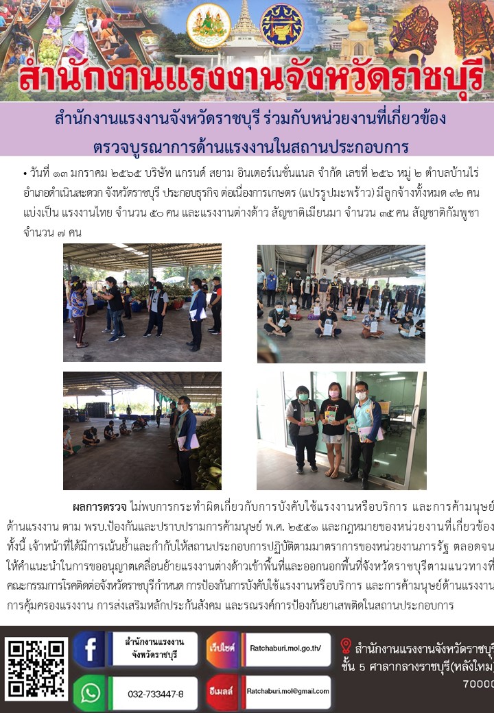 ผลการตรวจ ไม่พบการกระ ทำผิดเกี่ยวกับการบังคับใช้แรงงานหรือบริการ และการค้ามนุษย์ด้านแรงงานตาม พรบ.ป้องกันและปราบปรามการค้ามนุษย์ พ.ศ. ๒๕๕๑ และกฎหมายของหน่วยงานที่เกี่ยวข้อง ทั้งนี้ เจ้าหน้าที่ได้มีการเน้นย้ำและกำกับให้สถานประกอบการปฏิบัติตามมาตราการของหน่วยงานภารรัฐ ตลอดจนให้คำแนะนำในการขออนุญาตเคลื่อนย้ายแรงงานต่างด้าวเข้าพื้นที่และออกนอกฟื้นที่จังหวัดราชบุรีตามแนวทางคณะกรรมการโรคติดต่อจังหวัดราชบุรีกำหนด การป้องกันการบังคับใช้แรงงานหรือบริการ และการค้ามนุษย์ด้านแรงงาการคุ้มครองแรงงาน การส่งเสริมหลักประกันสังคม และรณรงค์การป้องกันยาเสพติดในสถานประกอบการ